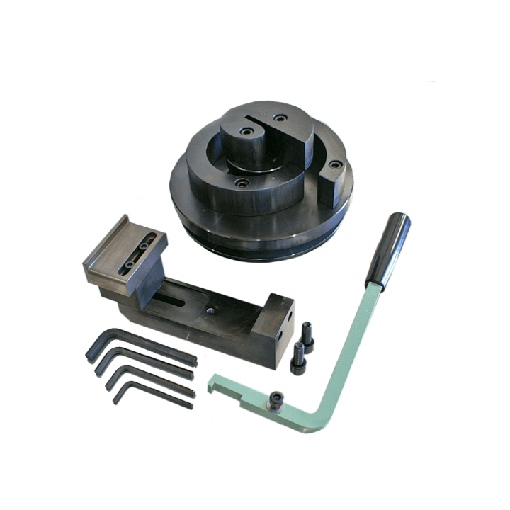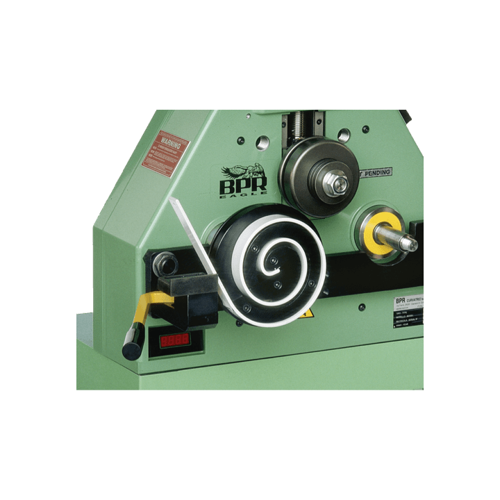 The tooling uses a mounting plate and a two-stage scroll former with a counter bend slide support assembly, which mounts on the lower left shaft of the bending machine. The two-stage former operates via a lever mounted on the counter bending guide.